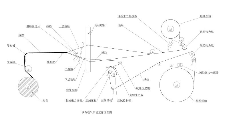 該產品可以織造經起絨絨布組織要求的雙層布織物,上下兩層之間有一定高度的絨經,后經過割絨機將其割開形成兩塊絨布。該產品采用智能化絨布噴氣織機專用控制系統,可以實現電子送經(地經、絨經分別控制)、電子控制起絨、電子多臂開口、電子控制管道片式噴氣引緯等功能,在織造過程中可以保持張力穩定、絨高織造控制精確,采用噴氣式引緯方式不會與經紗邊紗摩擦產生毛板,管道片接力引緯更能夠提高引為效率和降低能耗。